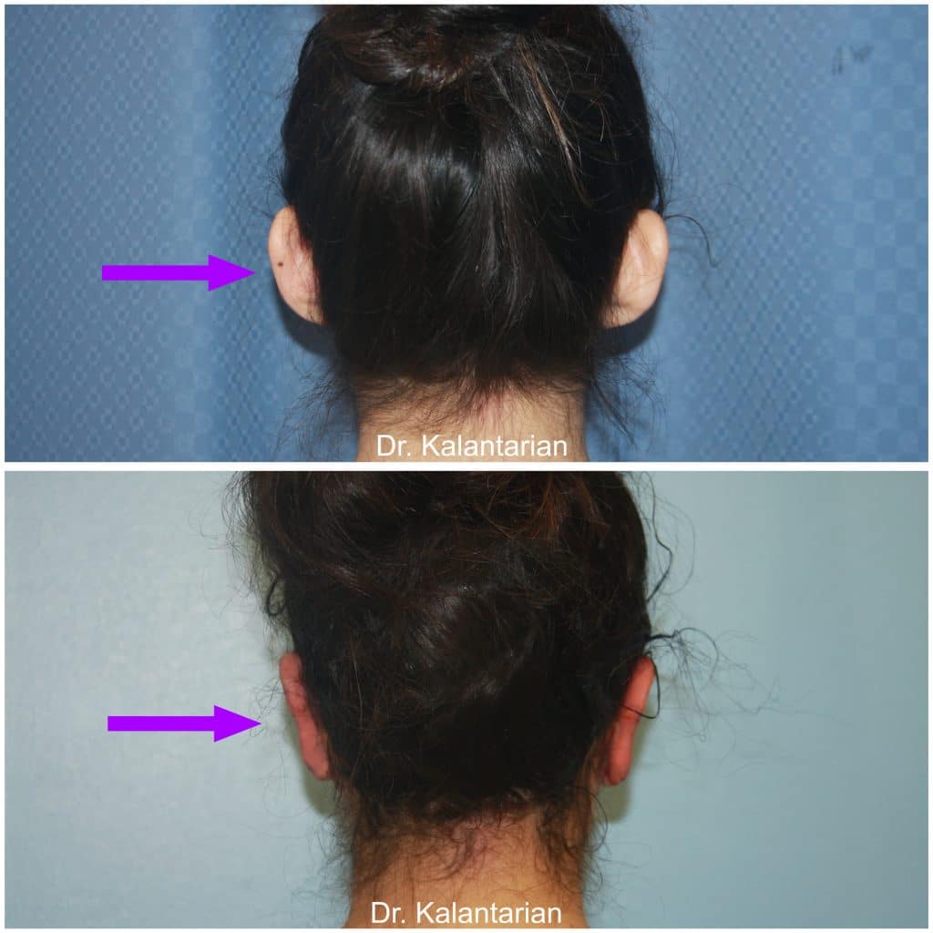 OC Dr. Kalantarian Plastic Surgery performed Otoplasty (reshaping of the ear or fixing a protruding ear) on this 26-year-old woman who wished to improve the appearance of her ears. She disliked how far her ears were sticking out and requested to have her ears pinned back. Dr. Kalantarian performed an Otoplasty by reshaping the cartilage with suture techniques which creates the antihelical fold (a fold near the ear rim that is responsible for keeping the upper third and some of the middle ear pushed back) which is often missing in a protruding ear. In addition, the middle part (upper and middle third junction) of the ear is pulled back by suturing the ear cartilage to the bone of the scalp. A small portion of the cartilage is also removed to set the ear back. The ear lobe is fixed or pulled by by excision of the skin and suturing technique. All incisions are well healed in the post auricular crease (the crease behind the ear, junction of ear and scalp). The result can be noted by looking at the before and after photos. The patient is very happy and has more self confidence in her appearance.